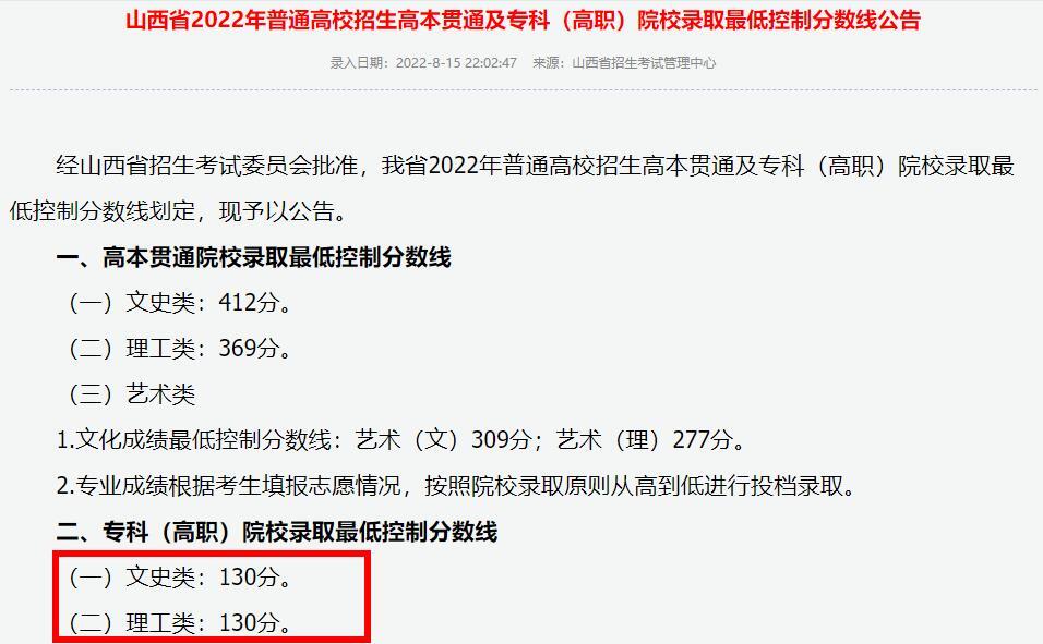 山西高考专科分数线2022年:文科130分、理科130分。