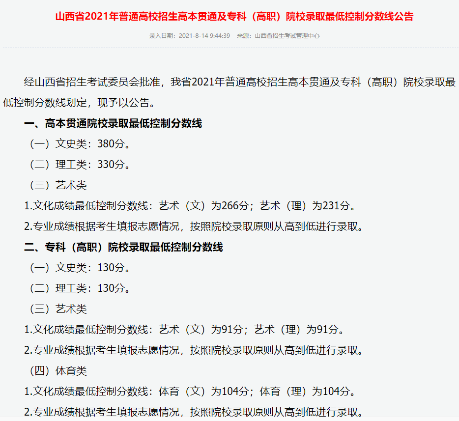 二、山西高考专科分数线2021年