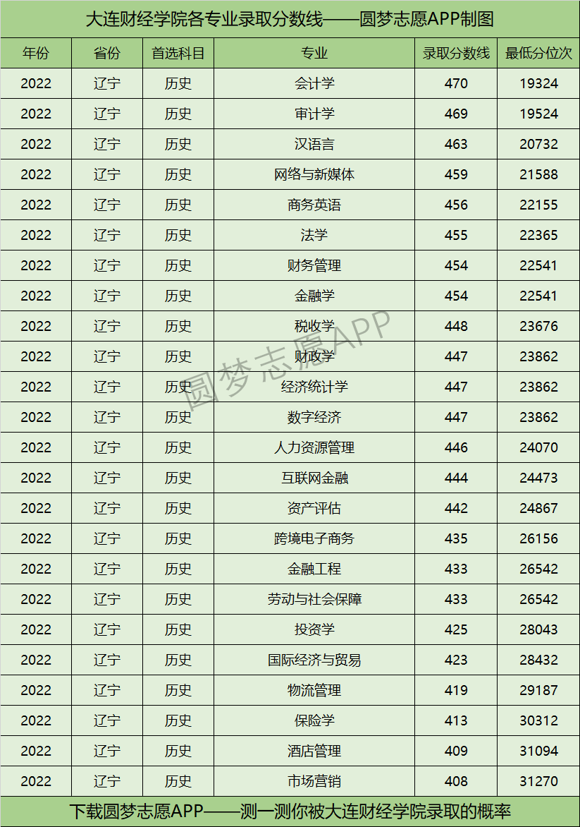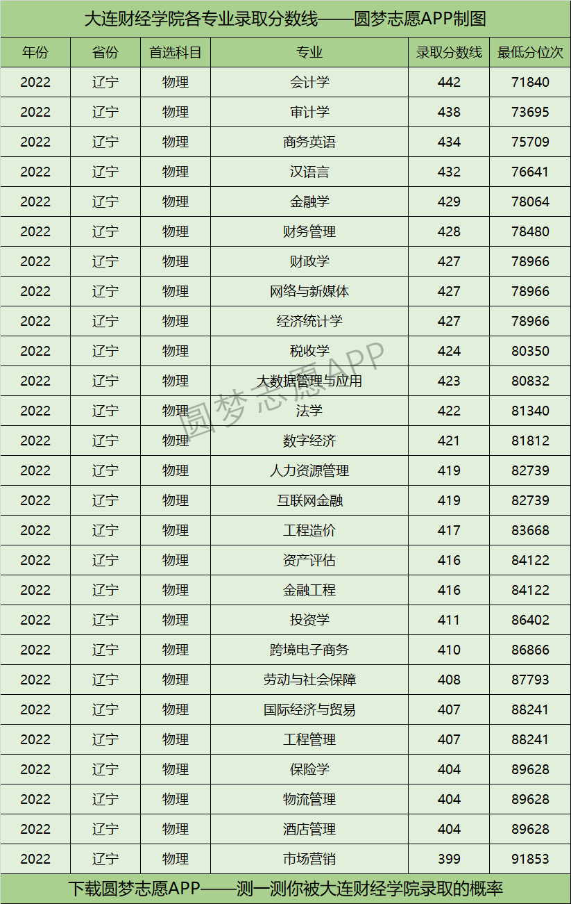 大连财经学院各专业录取分数线2022年是多少分?大连财经学院的最低分位次在全省排名多少?