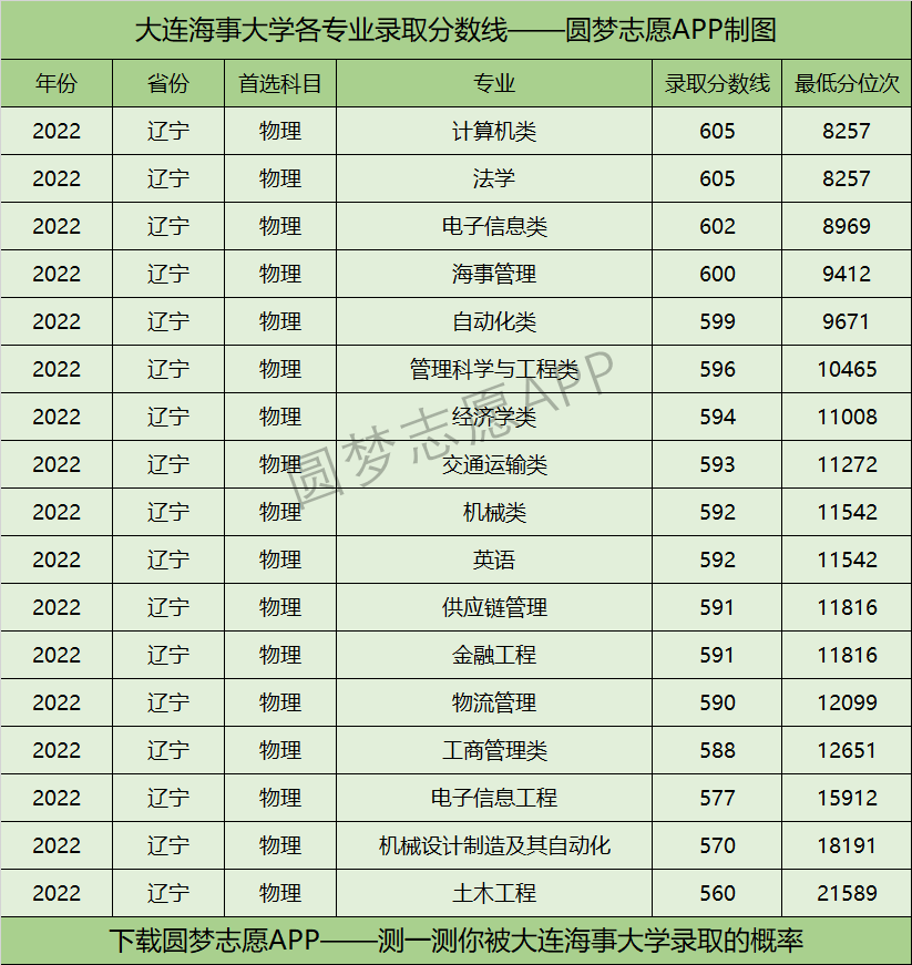 综上可知,大连海事大学2022年在辽宁物理类招普通类考生时,收分最低的为土木工程专业,其对应的最低分为560分,只要考进了辽宁物理类前21589名,就有机会被录取。