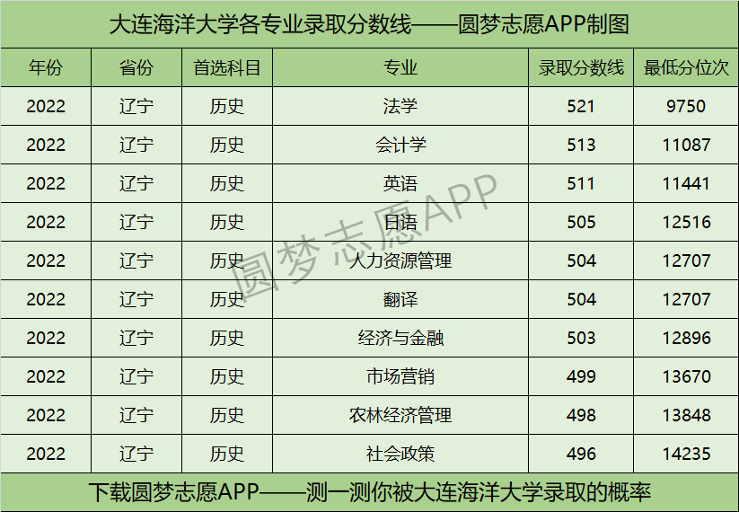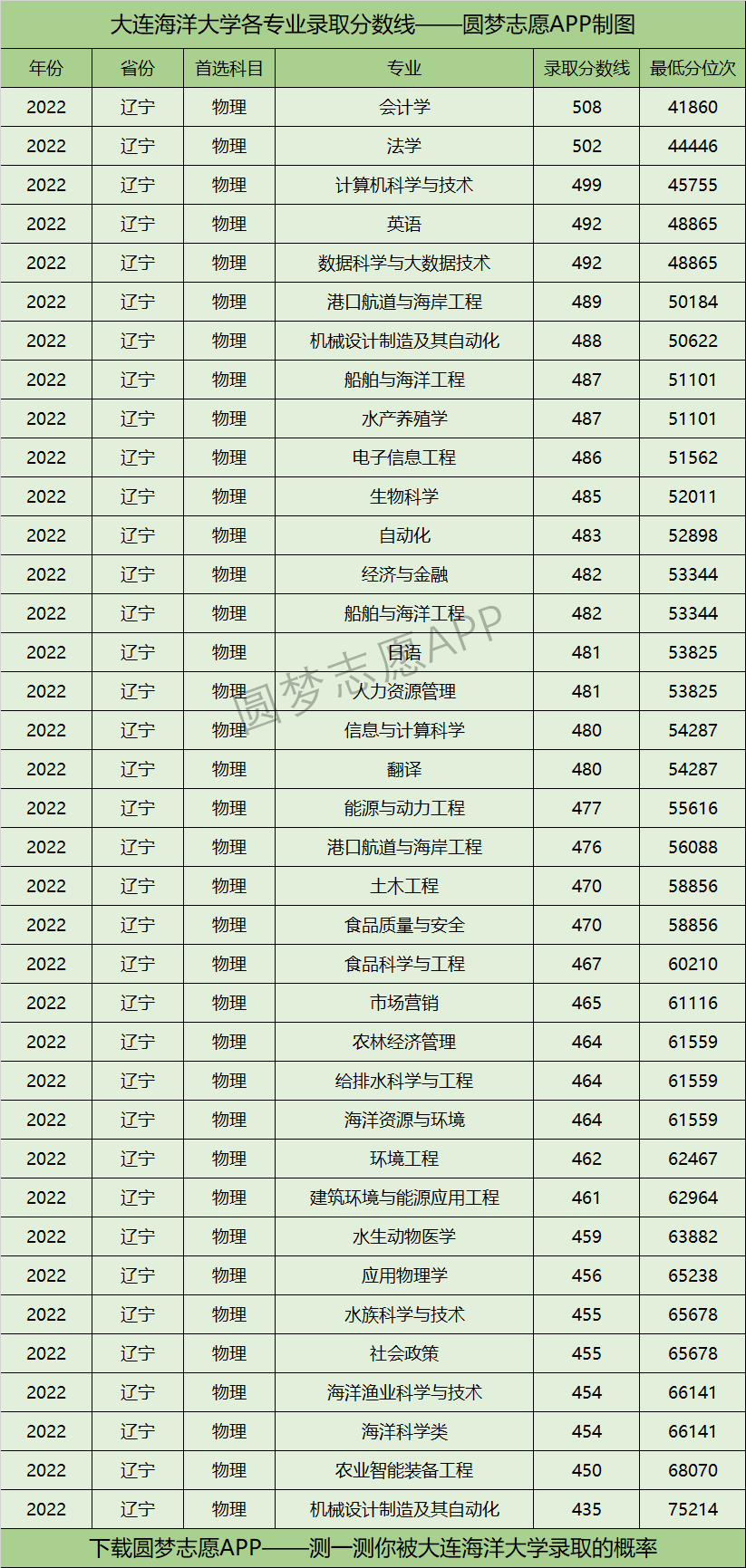 大连海洋大学各专业录取分数线2022年是多少分?大连海洋大学的最低分位次在全省排名多少?