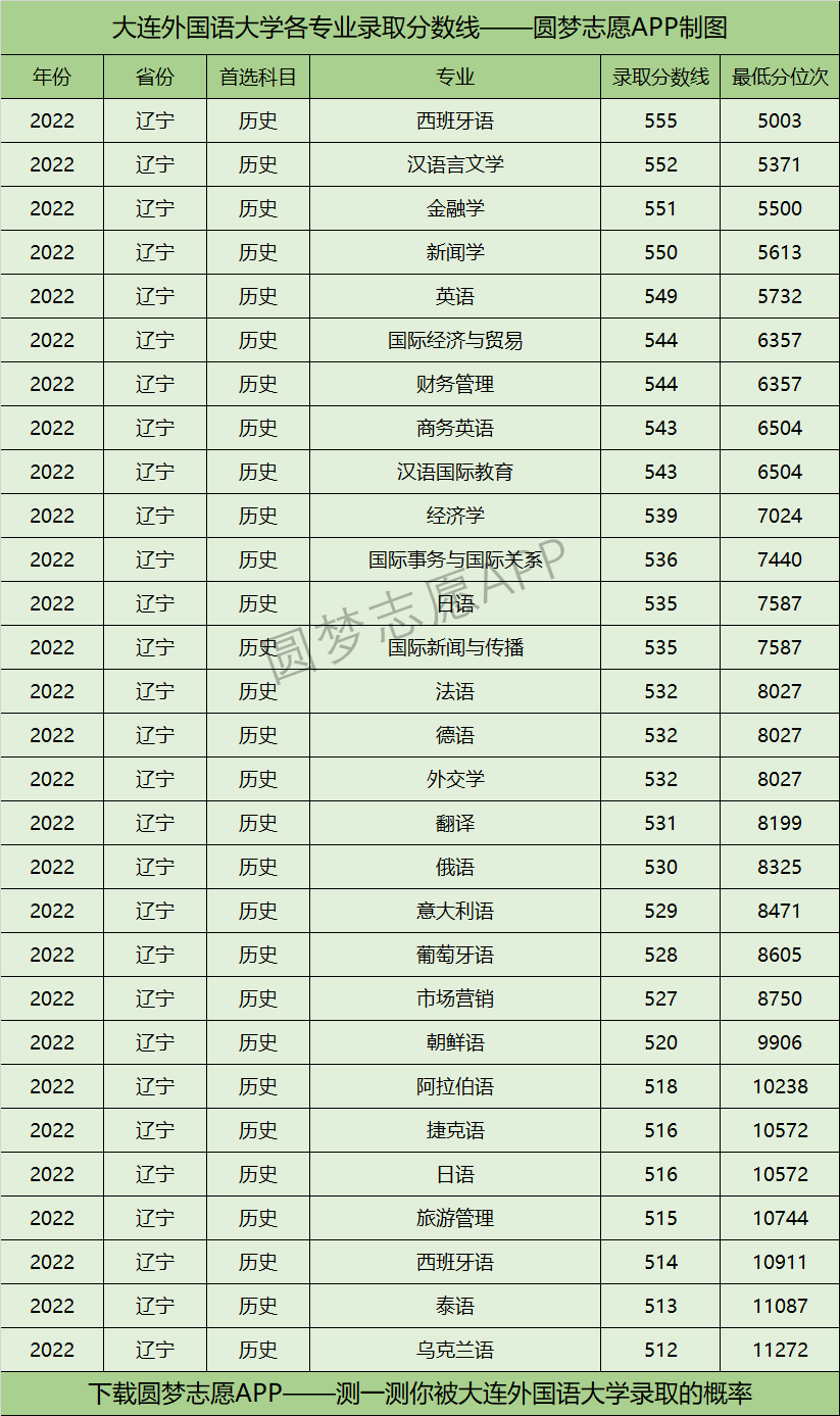 大连外国语大学各专业录取分数线2022年是多少分?大连外国语大学的最低分位次在全省排名多少?