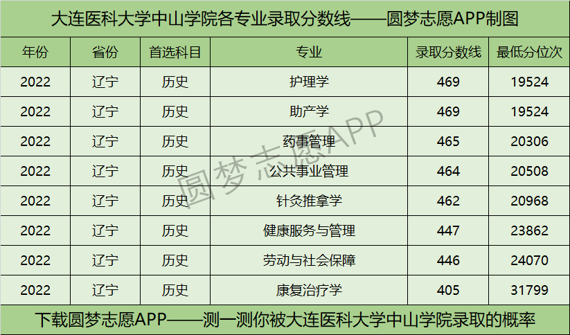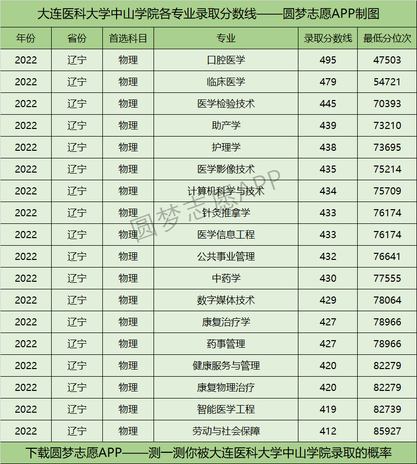 大连医科大学中山学院各专业录取分数线2022年是多少分?大连医科大学中山学院的最低分位次在全省排名多少?