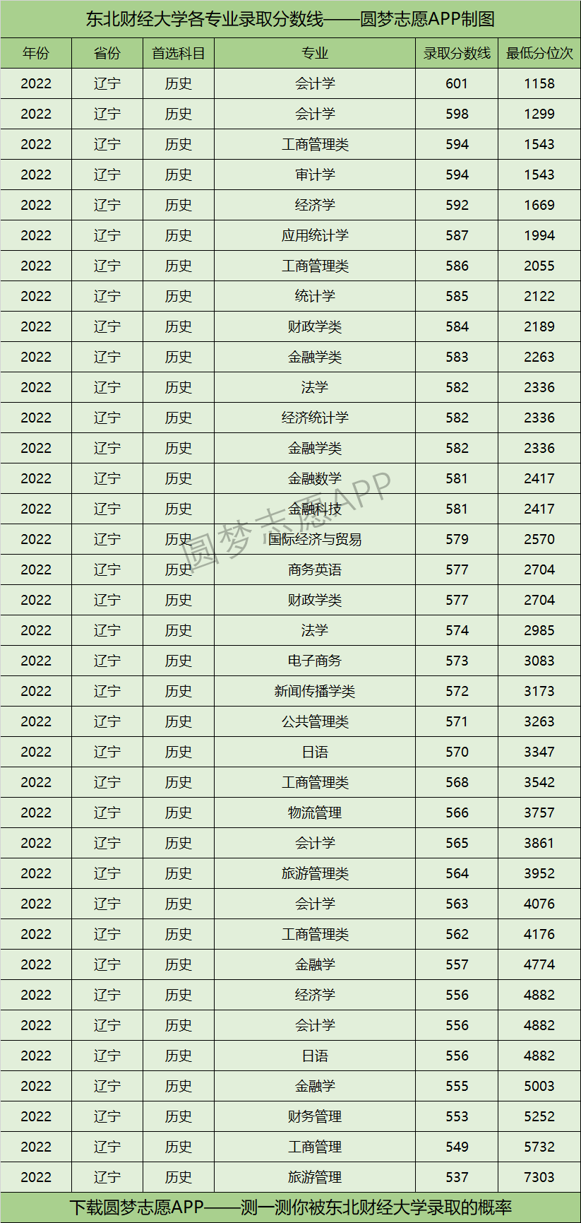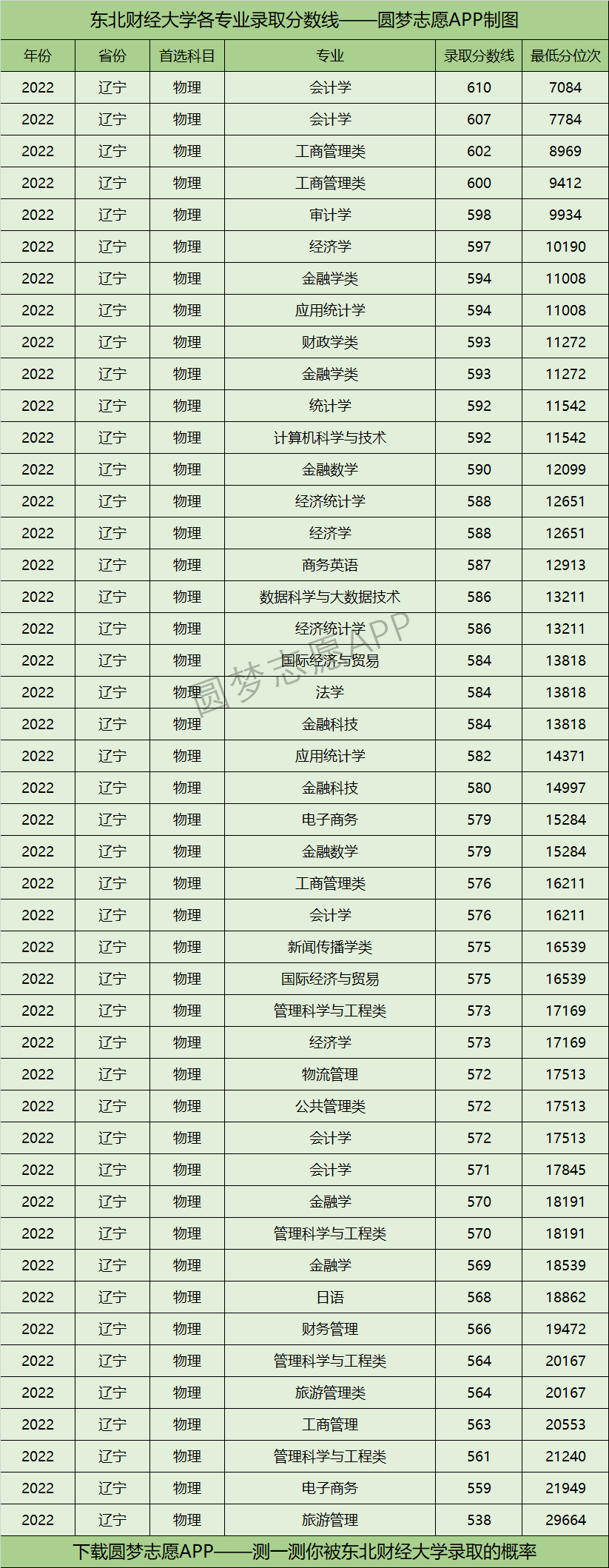 东北财经大学各专业录取分数线2022年是多少分?东北财经大学的最低分位次在全省排名多少?