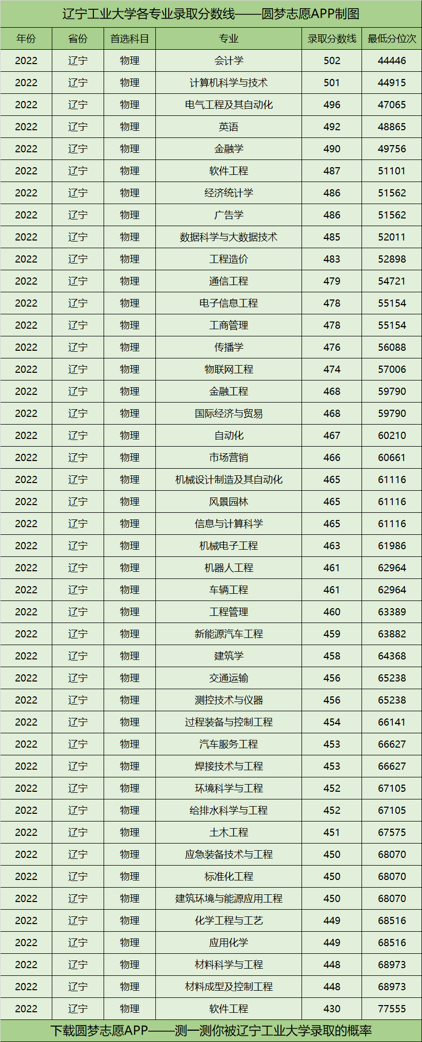 综上可知,辽宁工业大学2022年在辽宁物理类招普通类考生时,收分最低的为软件工程专业,其对应的最低分为430分,只要考进了辽宁物理类前77555名,就有机会被录取。