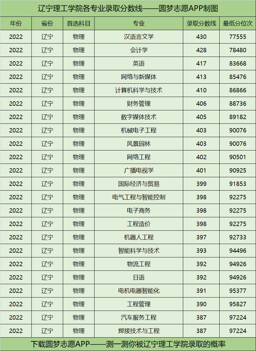 综上可知,辽宁理工学院2022年在辽宁物理类招普通类考生时,收分最低的为焊接技术与工程专业,其对应的最低分为387分,只要考进了辽宁物理类前97224名,就有机会被录取。