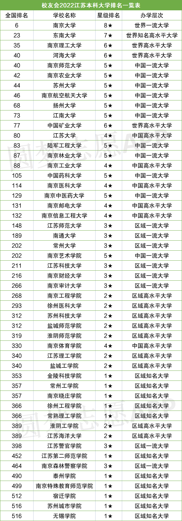 在校友会发布的江苏2022本科大学排名中,南京大学位居第1、东南大学第2、南京理工大学第3、河海大学第4、南京师范大学第5、南京农业大学第6、苏州大学第7、南京航空航天大学第8、扬州大学第9、江南大学第10、中国矿业大学第11,这11所大学都是我国的211大学兼双一流大学。