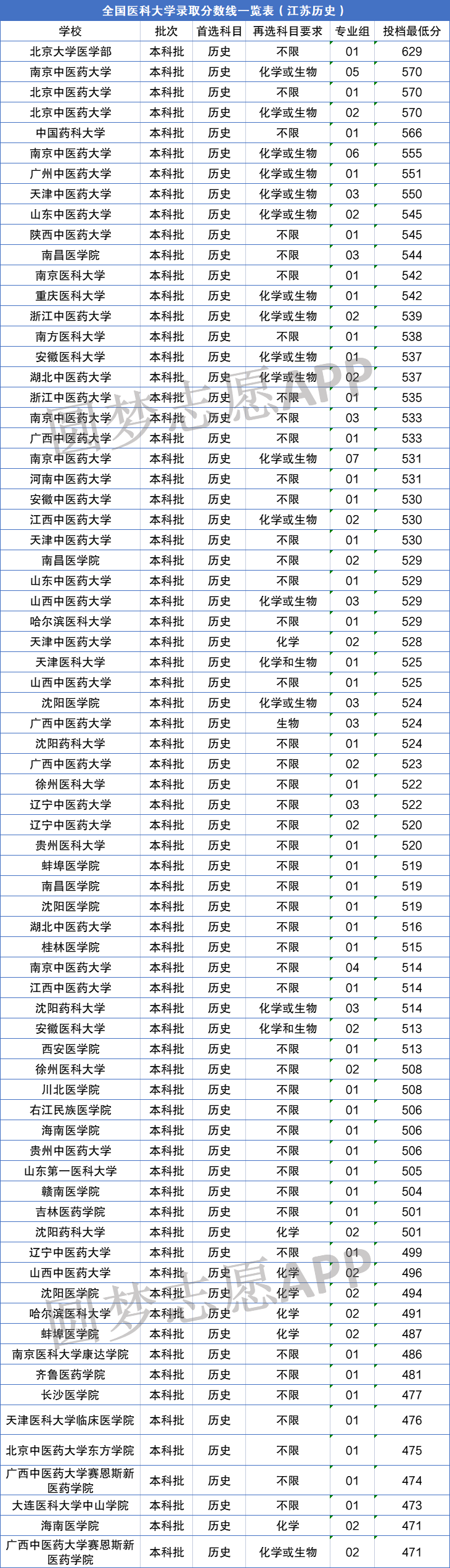 历史类,在医科大学的录取分数线中,北京大学医学部(01)629分位居第一、南京中医药大学(05)570分第2、北京中医药大学(01)570分第3、北京中医药大学(02)570分第4、中国药科大学(01)566分第5。