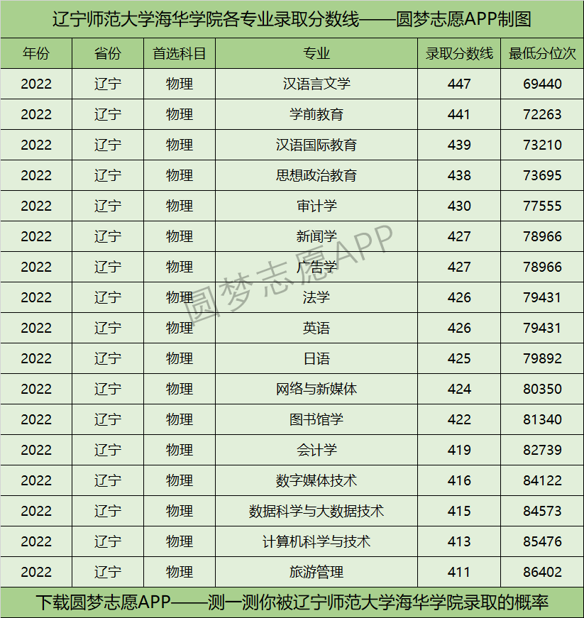综上可知,辽宁师范大学海华学院2022年在辽宁物理类招普通类考生时,收分最低的为旅游管理专业,其对应的最低分为411分,只要考进了辽宁物理类前86402名,就有机会被录取。