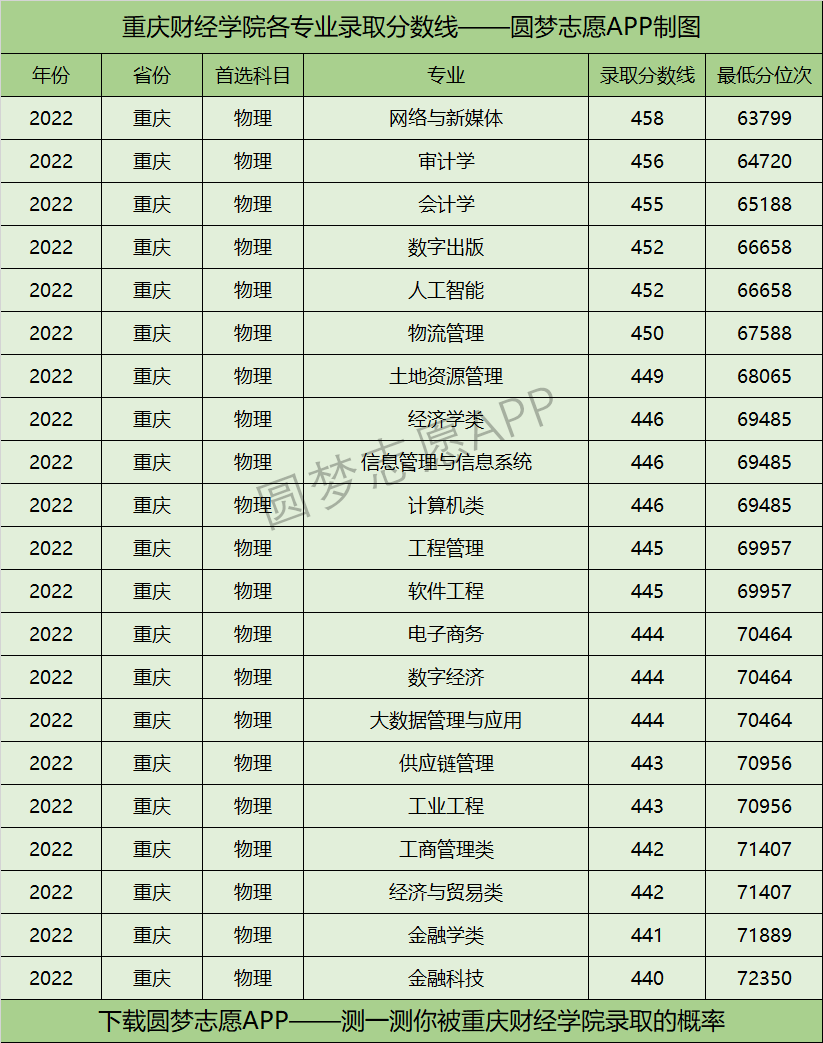 综上可知,重庆财经学院2022年在重庆物理类招普通类考生时,收分最低的为金融科技专业,其对应的最低分为440分,只要考进了重庆物理类前72350名,就有机会被录取。