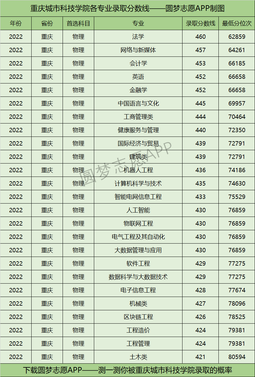综上可知,重庆城市科技学院2022年在重庆物理类招普通类考生时,收分最低的为土木类专业,其对应的最低分为421分,只要考进了重庆物理类前80594名,就有机会被录取。