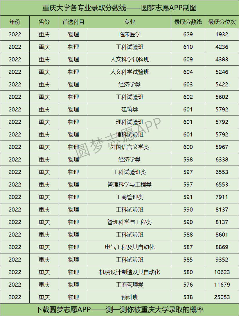 综上可知,重庆大学2022年在重庆物理类招普通类考生时,收分最低的为预科班专业,其对应的最低分为538分,只要考进了重庆物理类前25053名,就有机会被录取。