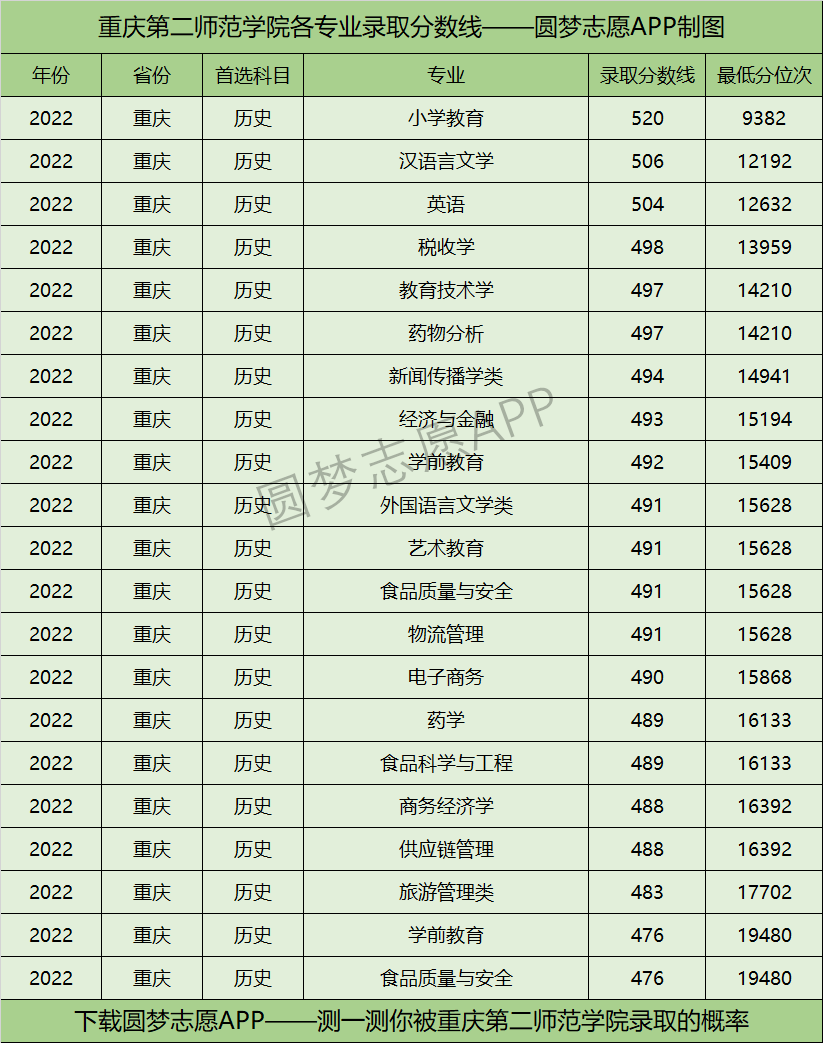 重庆第二师范学院各专业录取分数线2022年是多少分?重庆第二师范学院的最低分位次在全市排名多少?