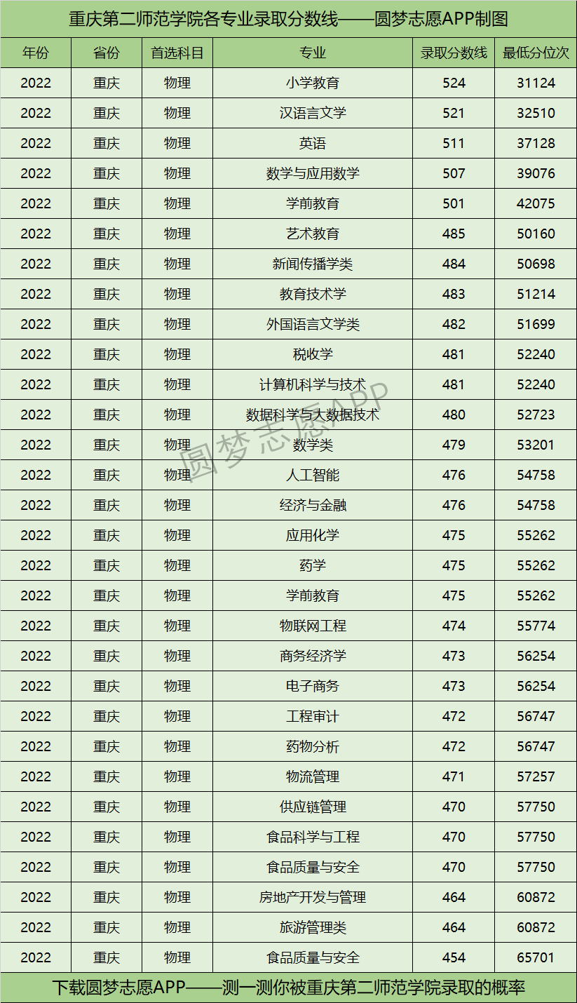 综上可知,重庆第二师范学院2022年在重庆物理类招普通类考生时,收分最低的为食品质量与安全专业,其对应的最低分为454分,只要考进了重庆物理类前65701名,就有机会被录取。