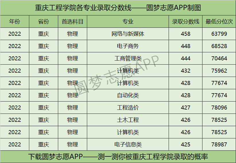 综上可知,重庆工程学院2022年在重庆物理类招普通类考生时,收分最低的为电子信息类专业,其对应的最低分为425分,只要考进了重庆物理类前78987名,就有机会被录取。