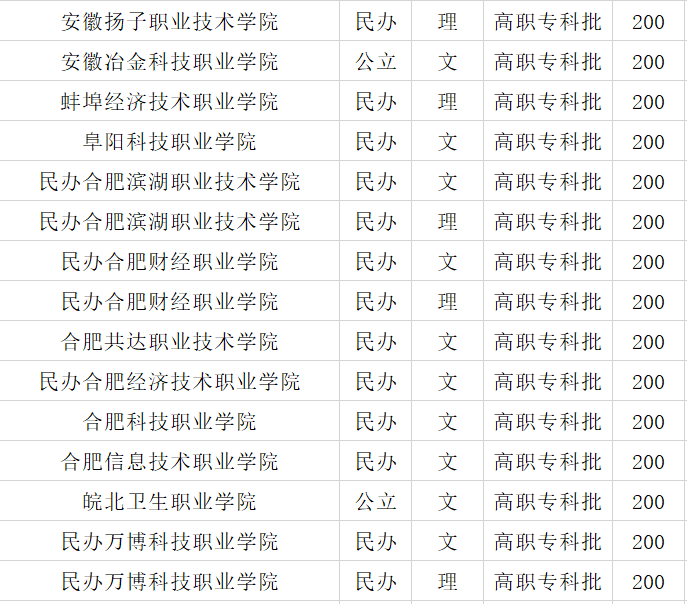 例如某考生考试成绩200多分,但是还是有非常多的学校可以选择,例如下表中就是几所安徽省200分文科理科考生可以参考的学校,其中不乏一些公办的院校,都是大家可以选择的。