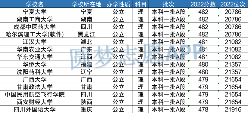由表可知,黑龙江480分左右的理科考生,可以报考宁夏大学482分,四川外国语大学478分。