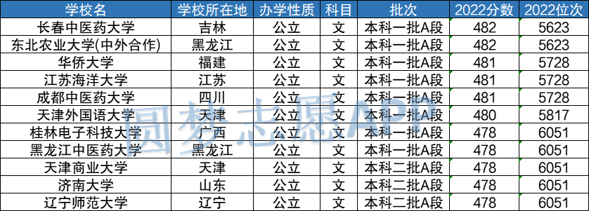 由表可知,黑龙江480分左右的文科考生,可以报考长春中医药大学482分,辽宁师范大学478分。