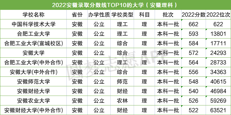 在安徽理科中,排名前十的这些大学录取分数线在522-662分之间,超过了本科线87-227分,所在的位次在622-63521之间。
