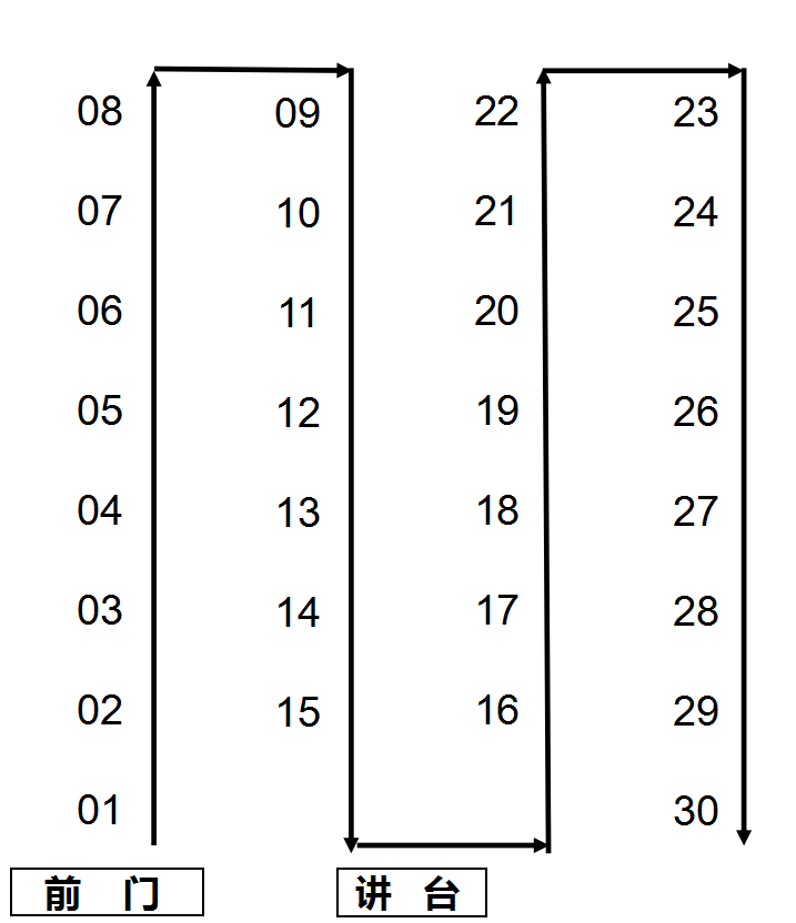 根据教室的布局,通常是六行五列的格局,第一桌的第一号是该考场的起始座位号。座位号按照S形路线排列,例如从前往后,依次是1、2、3、4、5、6,然后从后往前,依次是7、8、9、10、11、12,以此类推,直到最后一桌的最后一号(即30号)。